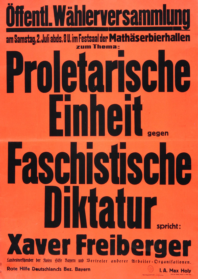 Veranstaltungshinweis der Roten Hilfe Deutschland über eine Kundgebung im Münchner Mathäserbräu, Juli 1932. (Bayerisches Hauptstaatsarchiv, Plakatsammlung 7862)