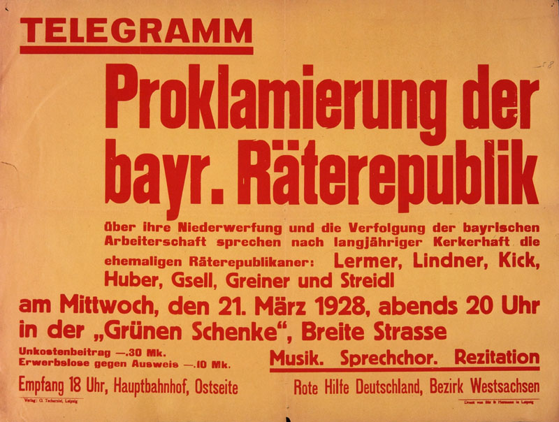 Veranstaltungshinweis der Roten Hilfe Deutschland über eine Kundgebung im Münchner Löwenbräukeller, April 1929. (Bayerisches Hauptstaatsarchiv, Plakatsammlung 15206)