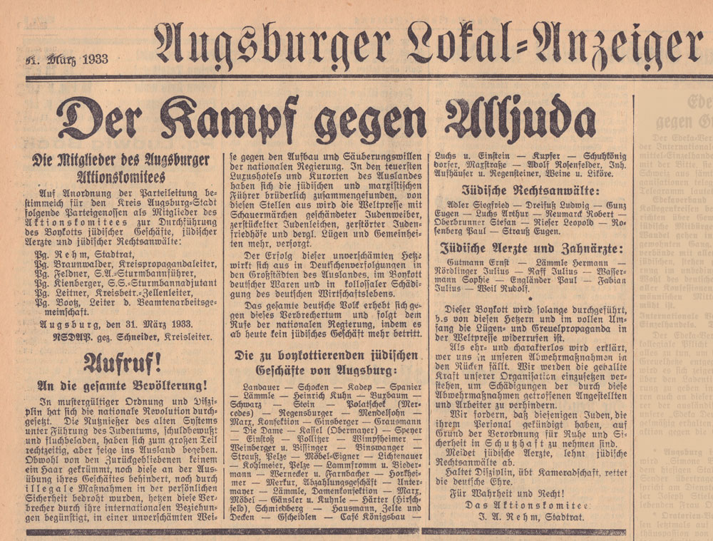 Aufruf zum Boykott jüdischer Geschäfte im Augsburger Anzeiger von 1933. Abb. aus: Neue National-Zeitung, Nr. 77 (31.3.1933), 6. (Bayerische Staatsbibliothek 2 Eph.pol. 78 v 3,1-4) HLB