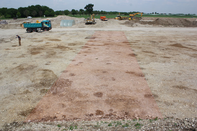 Aschheim Ausgrabung im östlichen Ortsbereich im Jahr 2012: Im Boden zeichnen sich die Pfostenlöcher eines zweischiffigen, 71 m langen und 6 bis 7 m breiten Langbaus ab (leicht rot unterlegt), der das Siedlungsareal im Süden begrenzte. Als Funktionsbau (Vorratshaus/Scheune oder Stallung) dürfte er Teil der villa publica, des 'öffentlichen Ortes' Aschheim gewesen sein, wo Mitte der 750er Jahre eine Synode stattfand. Die Größe des Baus spiegelt die Kapazität wider, die hier zur Versorgung einer großen Gesellschaft vorhanden war. (DigIt-Company/M. Wild; graph. Bearbeitung A. Pütz) HLB