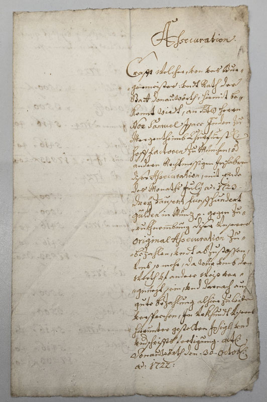 Assecurations-Abschrift betreffend eine Kapitalschuld der Stadt Donauwörth an Noel Samuel Isaac, Münchner Hoffaktor aus Mergentheim 1722/1723. (bavarikon) (Stadtarchiv Donauwörth, DON-H-0011) HLB