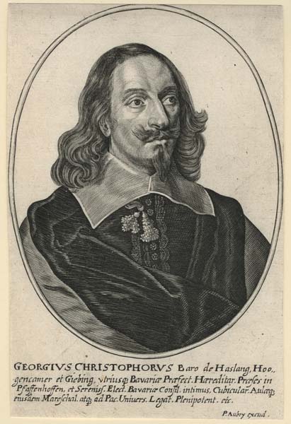 Georg Christoph Freiherr von Haslang zu Hohenkammer und Giebing (1602-1684), ab 1643 kurbayerischer Hofmarschall, ab 1662 Oberstkämmerer. Druck von Peter Aubry, 1645. (Münchner Stadtmuseum)
