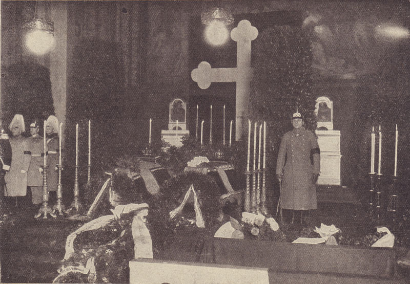 Aufbahrung Ludwigs III in der Ludwigskirche. Bis zum Morgen der Beisetzung blieben die Särge am Hochaltar der Ludwigskirche aufgebahrt. Abb. aus: Das Bayerland, Jahrgang 33 vom 02.11.1921, 69. (Bayerische Staatsbibliothek, 4 Bavar. 198 ta-33) HLB