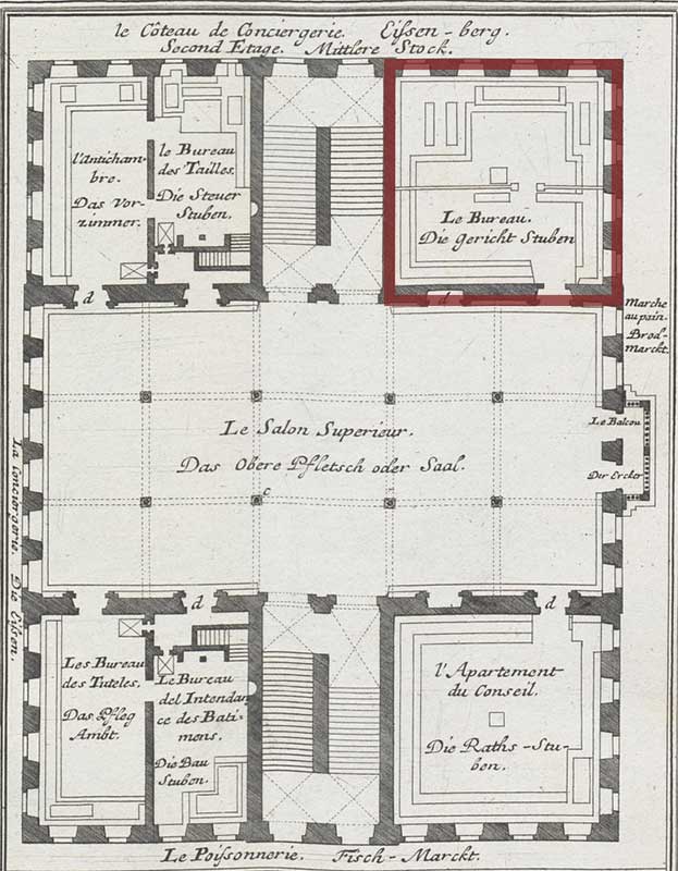 Die Gerichtsstube befand sich im ersten Stock des Rathauses (farblich markiert). Ausschnitt aus: Salomon Kleiner, Das Prächtige Rath Hauß der Stadt Augspurg, Augsburg 1733, Taf. III. (Bayerische Staatsbibliothek, Res/2 Bavar. 476 r)