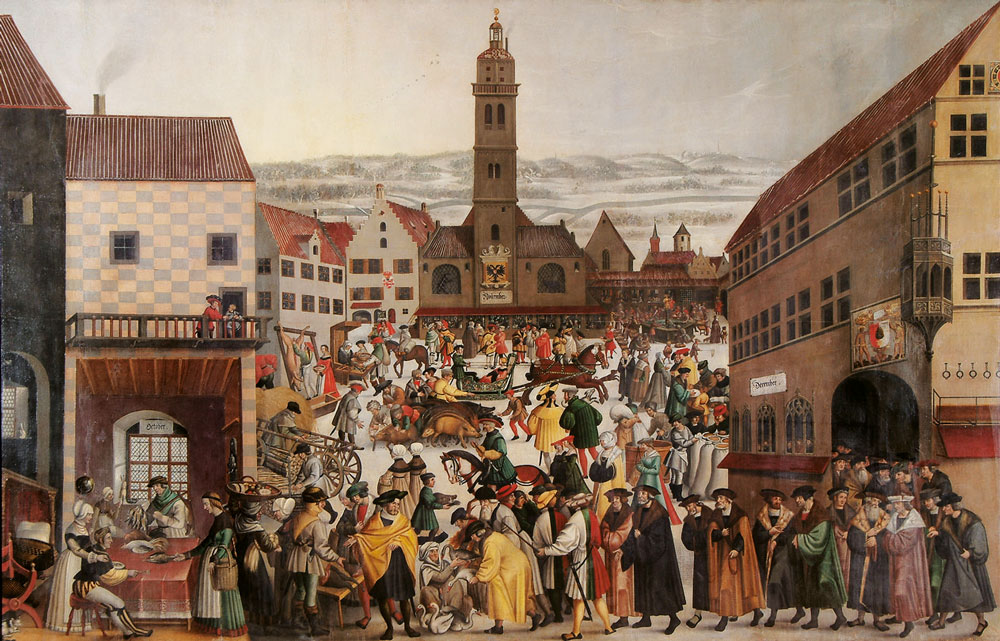 Idealisierte Darstellung des spätmittelalterlichen Marktgeschehen auf dem Augsburger Perlachplatz. Gemälde (Öl auf Leinwand) von Heinrich Vogtherr d. J. (?), entstanden um 1540. (Kunstsammlungen und Museen Augsburg, Inv. Nr. 9330)