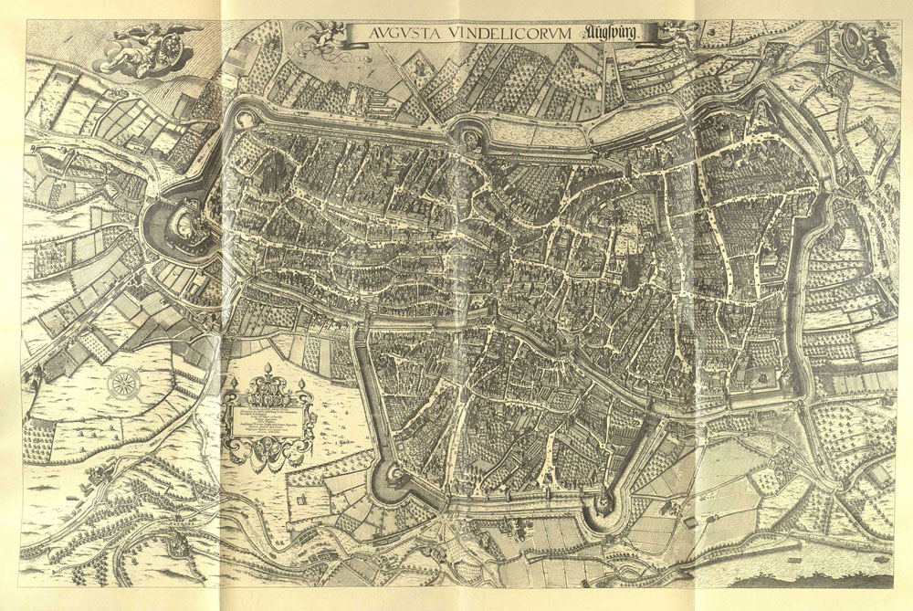 Stadtplan von Augsburg von Wolfgang Kilian (1581-1662) von 1626. Abb. aus: Steinhäusser, Augsburg in kunstgeschichtlicher, baulicher und hygienischer Beziehung, Augsburg 1902. (bavarikon) (Universitätsbibliothek Augsburg 221/NS 2565 S822)