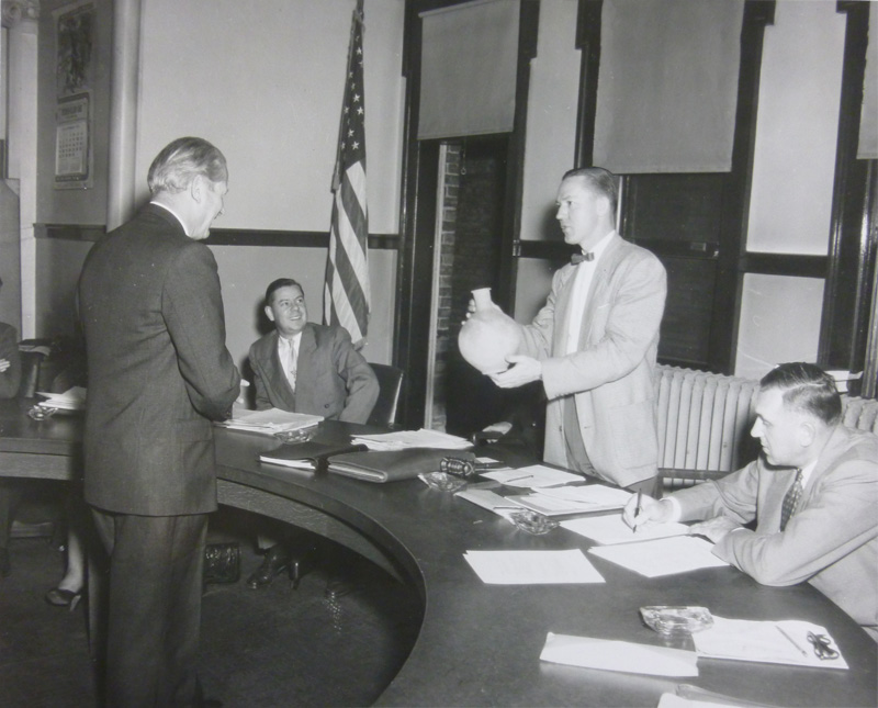 August Fischer (1901-1986, OB von Kempten 1952-1970) überreicht Vertretern der Stadt Kenosha (Wisconsin, USA) eine bei Ausgrabungen in Kempten gefundene römische Amphore als Gastgeschenk. Fischer stand an der Spitze einer achtköpfigen Gruppe aus Kempten, die 1954 eine zweimonatige Studienreise in die USA unternahm. Thema der Reise war das Kommunalwesen amerikanischer Städte. Aufnahme vom 4. Oktober 1954. (Stadtarchiv Kempten) HLB