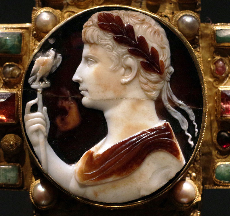 Augustus mit langem Adlerszepter. Kameo des frühen 1. Jhs. auf dem Lothar-Kreuz (letztes Viertel 10. Jhs.) im Aachener Domschatz. (Foto von Sailko lizensiert durch CC BY 3.0 via Wikimedia Commons) HLB