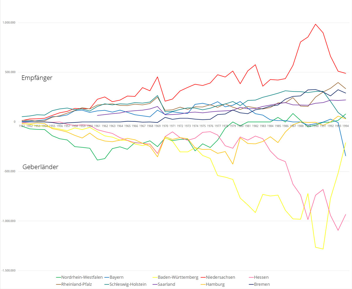 Ausgleichsbeiträge (-) und Ausgleichszuweisungen der einzelnen Länder im Länderfinanzausgleich (in TEuro), 1951-1994. (Quelle: Bundesfinanzministerium) HLB
