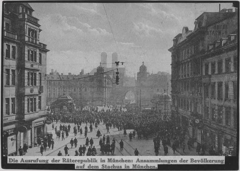 Ansammlung Münchner Bürger auf dem Karlsplatz (Stachus) nach der Ausrufung der zweiten Räterepublik. (Bayerisches Hauptstaatsarchiv, Bildersammlung 03834) HLB