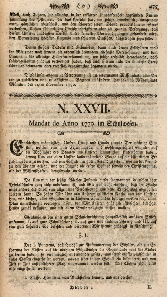 Mandat im Schulwesen von 1770. Abb aus: Sammlung der neuest und merkwürdigsten Churbaierischen Generalien und Landesverordnungen, München 1771, 475. (Bayerische Staatsbibliothek, 2 Bibl.Mont. 4499) HLB