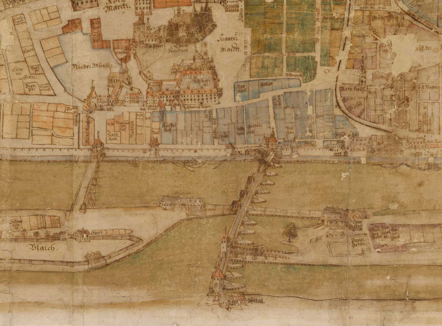 Der Ausschnitt des Stadtplans von Regensburg zeigt das Gebeit des Domplatzes bis zur Donau. Ausschnitt aus: Beyläuffiger Entwurff. Wie die Grund Stück alhier in Regenspurg liegen und die 8. Wachten aneinander stossen, n. 1700. (Bayerische Staatsbibliothek, Cod. icon. 400)
