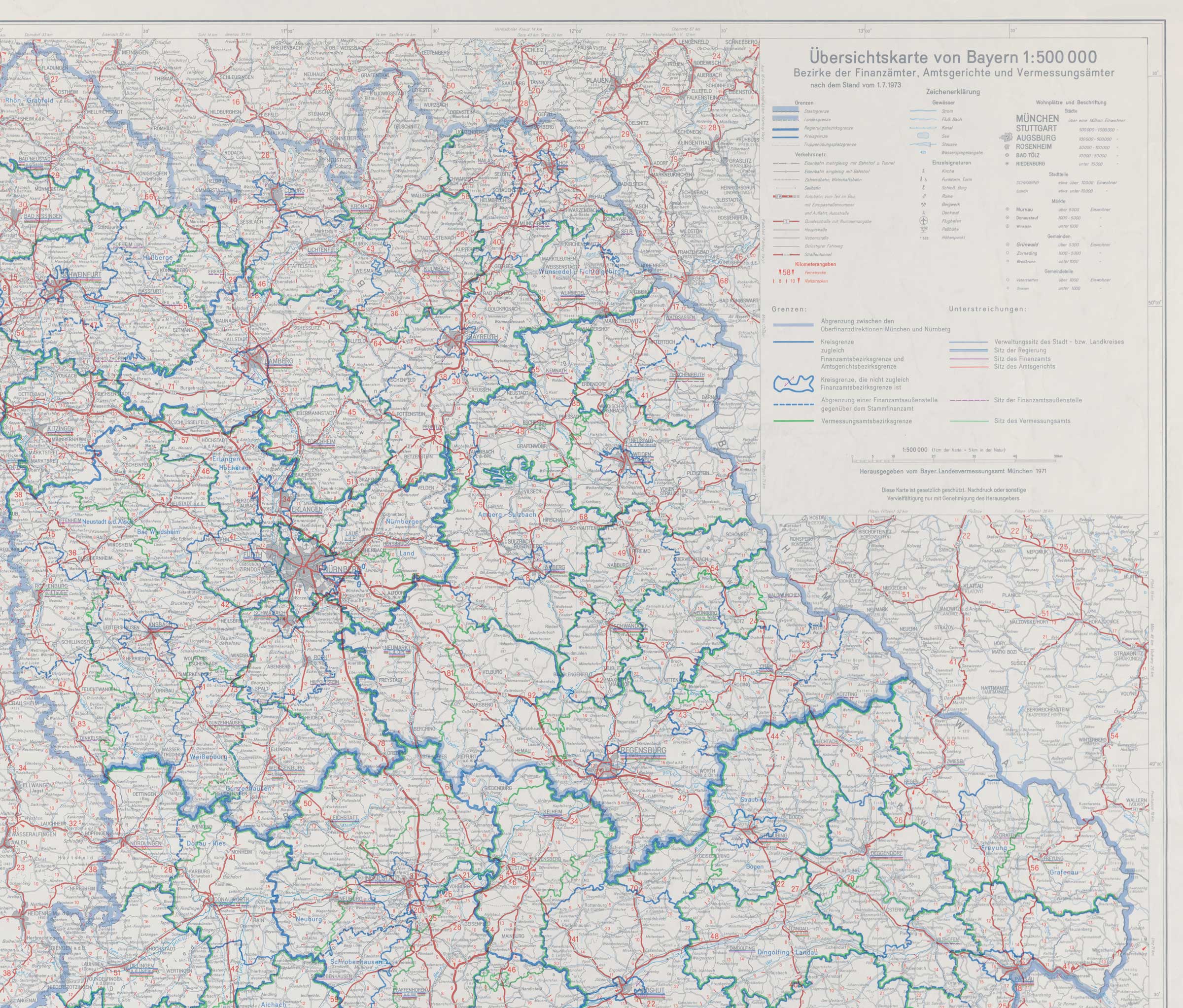 Ausschnitt einer Übersichtskarte von Bayern. Bezirke der Finanzämter, Amtsgerichte und Vermessungsämter. Stand 1.7.1973. Herausgegeben vom Bayer. Landesvermessungsamt München, 1971. (Geobasisdaten: Bayerische Vermessungsverwaltung Nr. 2506-011125. Bayerische Staatsbibliothek, Mapp. XI,575 ld) HLB