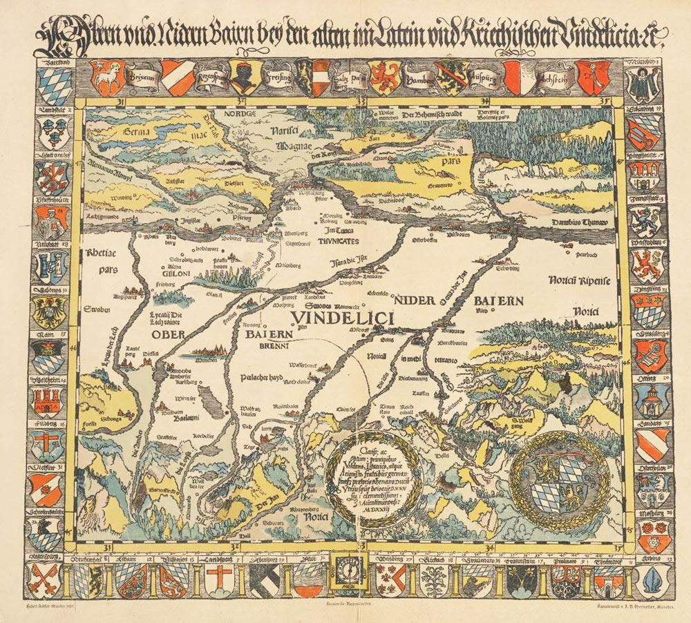 Älteste Karte Bayerns von 1523, gezeichnet von Johannes Aventinus (1477-1534), hier ein kolorierter Nachdruck von 1899. Eine zoombare Version finden sie hier. (Bayerische Staatsbibliothek, Mapp. XI,24 x)