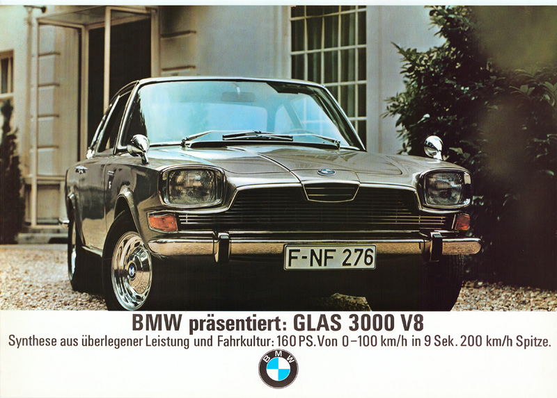 Nach der Übernahme durch BMW wurden einige Fahrzeuge weiterhin produziert. Vom 1965 auf der Internationalen Automobilausstellung (IAA) in Frankfurt präsentierten Glas V8 (Serienproduktion als Glas 2600 V8) wurden nur sehr wenige Fahrzeuge produziert. 1967 modifizierte BMW den sog. Glaserati (eine Anspielung auf das italienische Design des Fahrzeugs und den großen V8-Motor) und brachte ihn als BMW Glas 3000 V8 auf den Markt. Auch er war kein Volumenmodell und wurde 1968 bereits wieder eingestellt. Neben einigen technischen Details änderte BMW bis zur Einstellung der Glas-Modelle lediglich die Typenbezeichnungen und ergänzte die markentypischen Merkmale Niere und Emblem. Plakt des BMW GLAS 3000 V8, entstanden zwischen 1967 und 1968. (BMW Group Archiv, BMW AF-4694-1) HLB