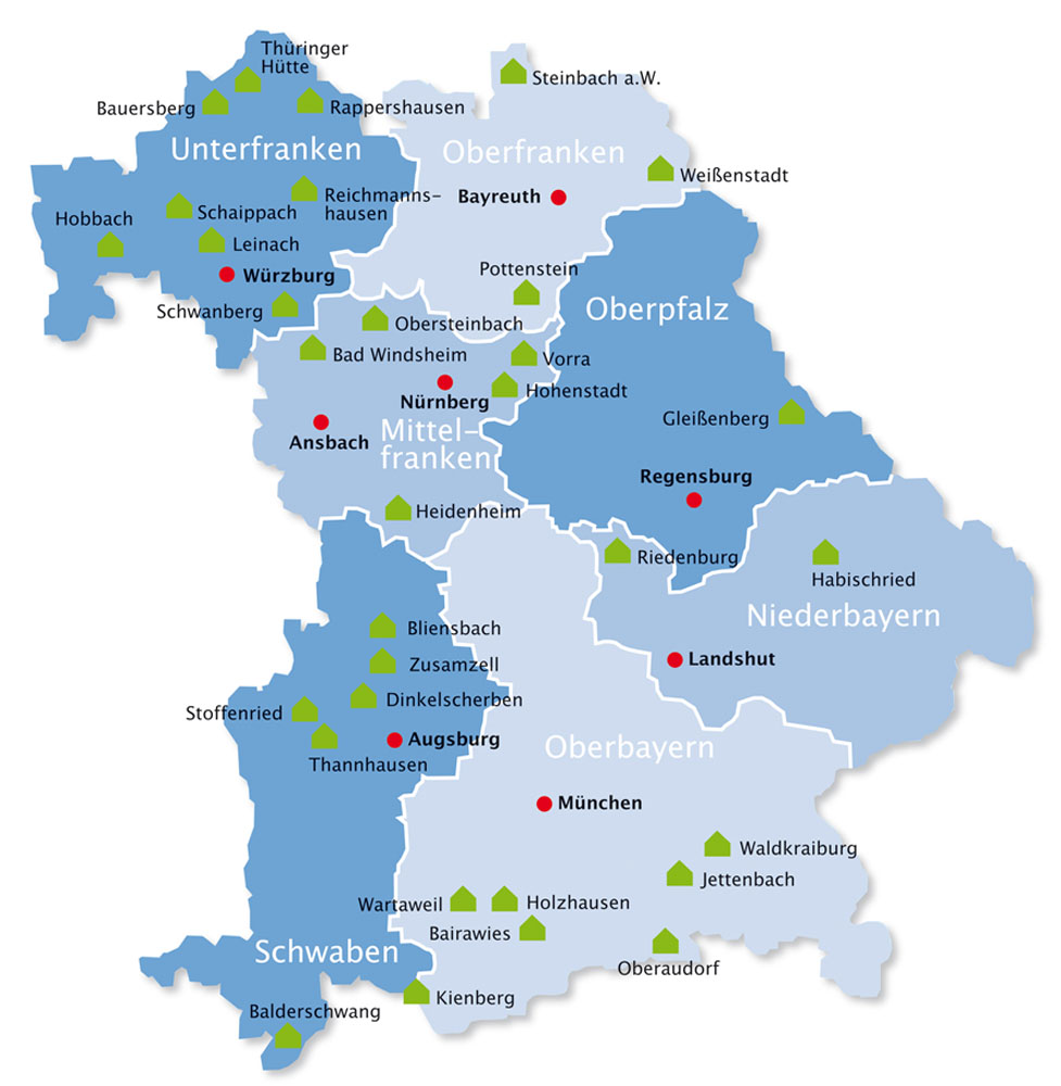 Die Schullandheime des Bayerischen Schullandheimwerks e.V. im Freistaat Bayern, Stand: November 2017. (Karte: Bayerisches Schullandheimwerk e. V.)