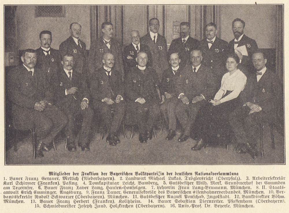 Mitglieder der Fraktion der Bayerischen Volkspartei der deutschen Nationalversammlung. Abb. aus: Das Bayerland 31 (1919), 137. (Bayerische Staatsbibliothek, 4 Bavar. 198 t-31)