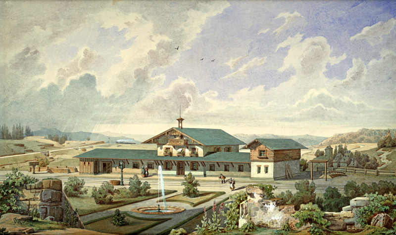 Die Bahnstation Günzach im alpenländischen Stil, um 1855. Aquarell von Karl Herrle (1828-1878). (DB Museum Nürnberg, 2019.002477) HLB