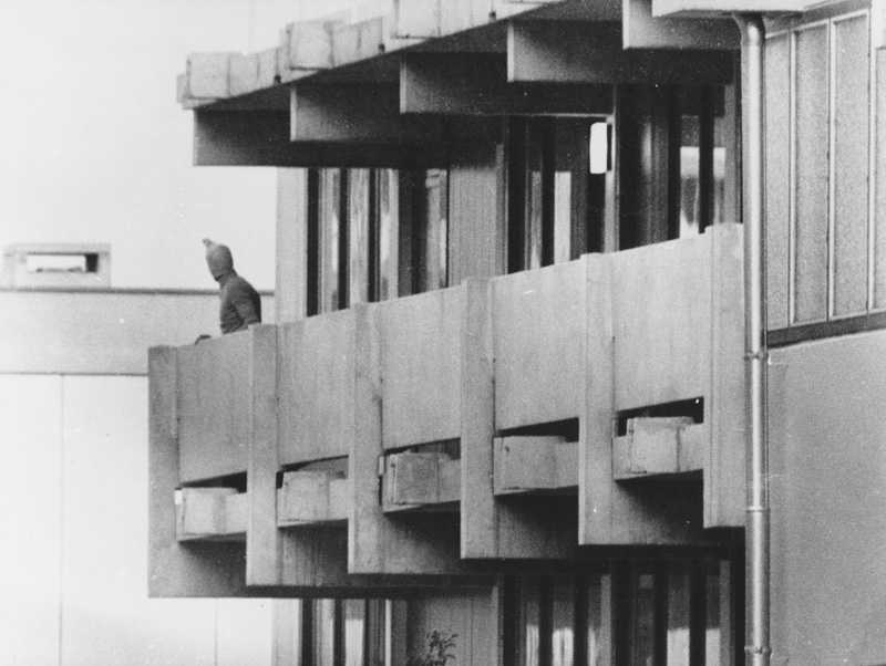 Einer der Attentäter des "Schwarzen September" auf dem Balkon in der Connollystraße 31 im Olympiadorf in München. (Bayerische Staatsbibliothek, Bildarchiv stern-hin-000001) HLB