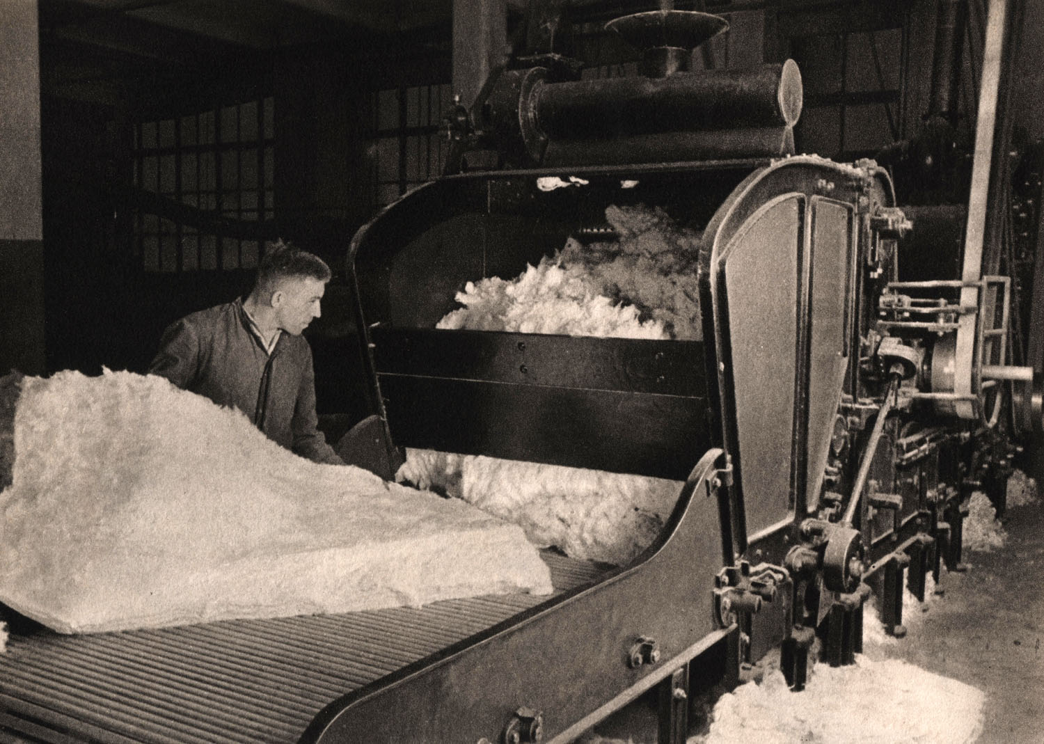 Vom Ballenbrecher werden die Wollballen zerflockt, damit die Wolle in der Spinnerei weiterverarbeitet werden kann. (aus: Hundert Jahre Mechanische Baumwollspinnerei und Weberei Augsburg, München 1937, S. 218)
