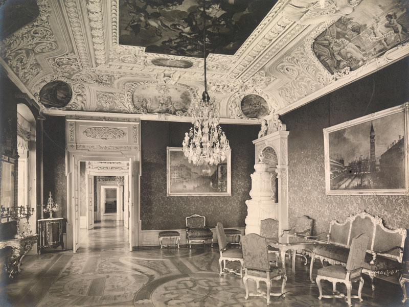 Für die Musealisierung der zuvor verschiedenen genutzten Räume wurde häufig zeitlich passendes Mobiliar aus anderen Schlössern genutzt, da die ursprüngliche Ausstattung nicht mehr vorhanden war. Das Foto zeigt das Audienzzimmer der Kaiserzimmer in der Neuen Residenz Bamberg vor 1945. (Staatsbibliothek Bamberg, V Bt 52, lizensiert durch CC-BY-SA 4.0)