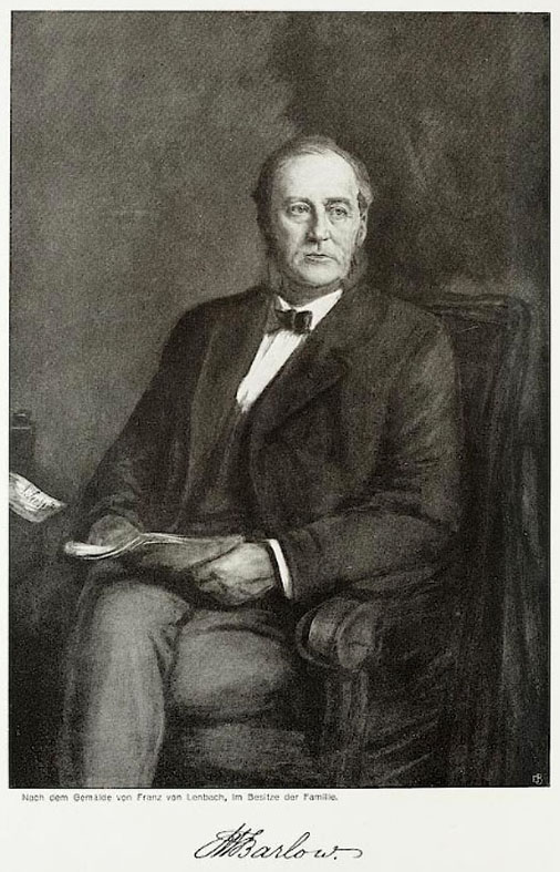 Der britische Privatier Richard Barlow (1826–1882). 1876 erwarb er das zwischen Karolinenplatz und Königsplatz gelegene Adelspalais, von da ab "Palais Barlow" genannt. 1882 vererbte er es seinem Sohn, dem Industriellen Willy Barlow (1869–1928). Dessen Witwe verkaufte die Liegenschaft für 805.864 Goldmark am 26. Mai 1930 an die NSDAP. Das Palais Barlow wurde zum "Braunen Haus" umgewidmet und war Ausgangspunkt der zahlreichen Parteibauten in der näheren und weiteren Umgebung. (aus: Hugo Helbing [Hg.], Sammlung Barlow †, München 1911, Frontispiz, Universitätsbibliothek Heidelberg)