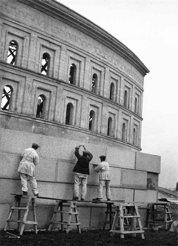 Besichtigung der Baumaßnahmen zum Reichsparteitagsgelände am 5. März 1937. Arbeiter an der Probefassade der Kongresshalle. Fotografie von Heinrich Hoffmann. (Bayerische Staatsbibliothek, Bildarchiv hoff-15010) HLB