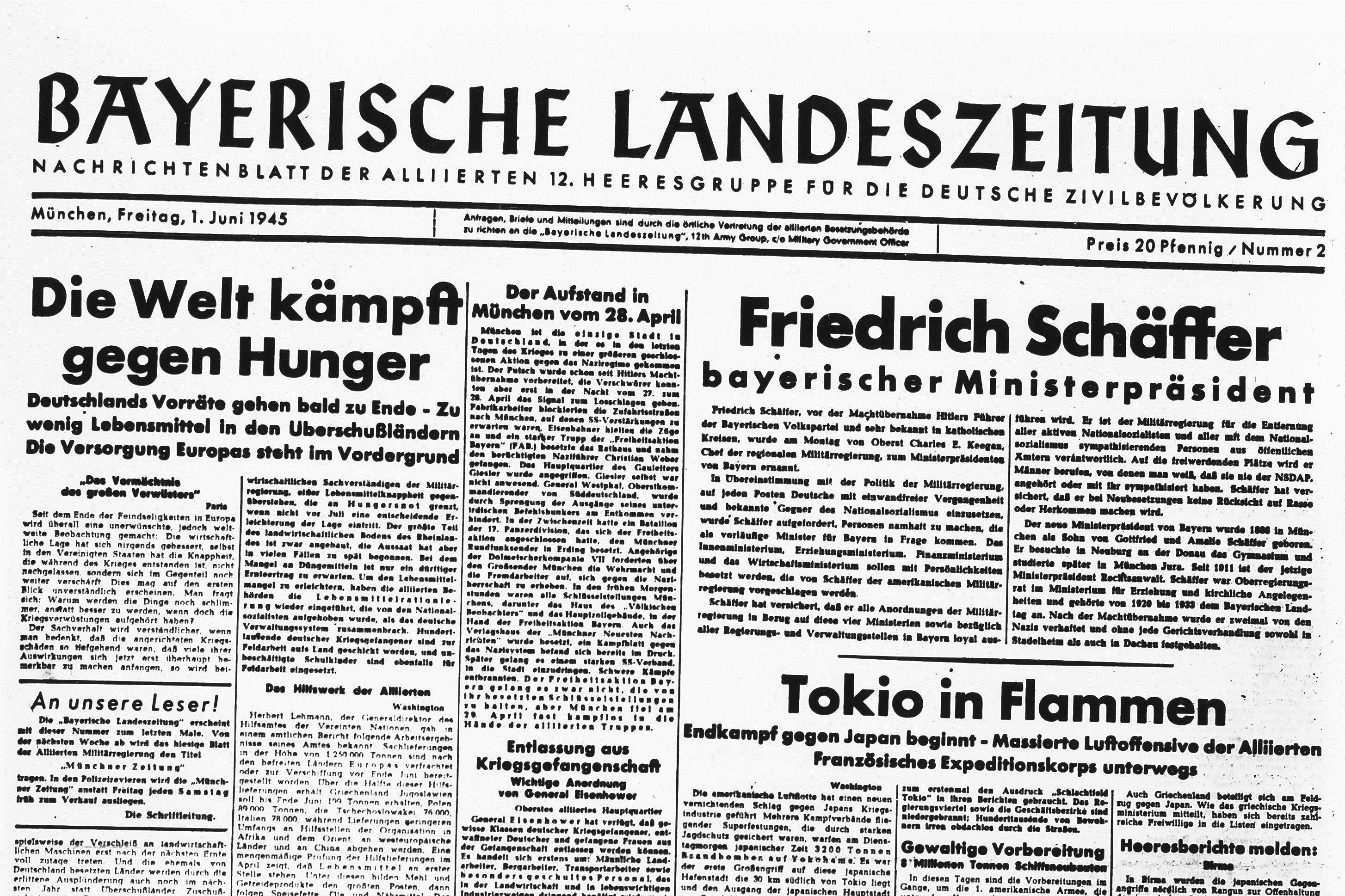 Titelblatt der Bayerischen Landeszeitung vom 1. Juni 1945. Der ehemalige Vorsitzende der Bayerischen Volkspartei (BVP), Fritz Schäffer (CSU, 1888-1967, Ministerpräsident 1945) wurde am 28. Mai 1945 von der amerikanischen Militärregierung zum "Temporary Minister-Präsident for Bavaria" ernannt. Bereits wenige Monate später wurde er von der Militärregierung am 28. September 1945 seines Amtes enthoben. (Foto: Bayerische Staatsbibliothek, Fotoarchiv Hoffmann, hoff-64500)