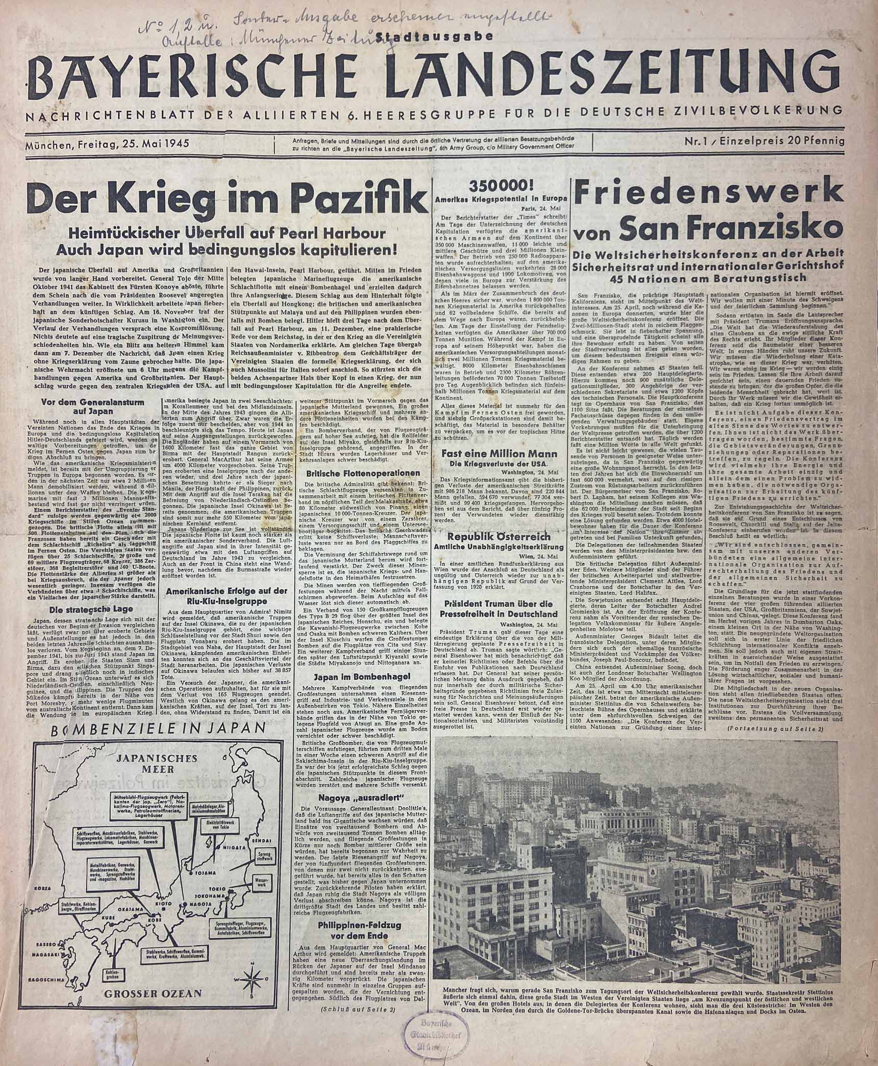 Titelblatt der Bayerischen Landeszeitung vom 25. Mai 1945. (Bayerische Staatsbibliothek, 2 Z 45.12) HLB