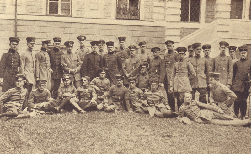 Bayerische Offiziersflieger im alten Schloßhof zu Schleißheim vor dem Abrücken ins Feld. (Abb. aus: Zeidelhack, Max: Bayerische Flieger im Weltkrieg: Ein Buch der Taten und Erinnerungen. München 1919, 3) HLB