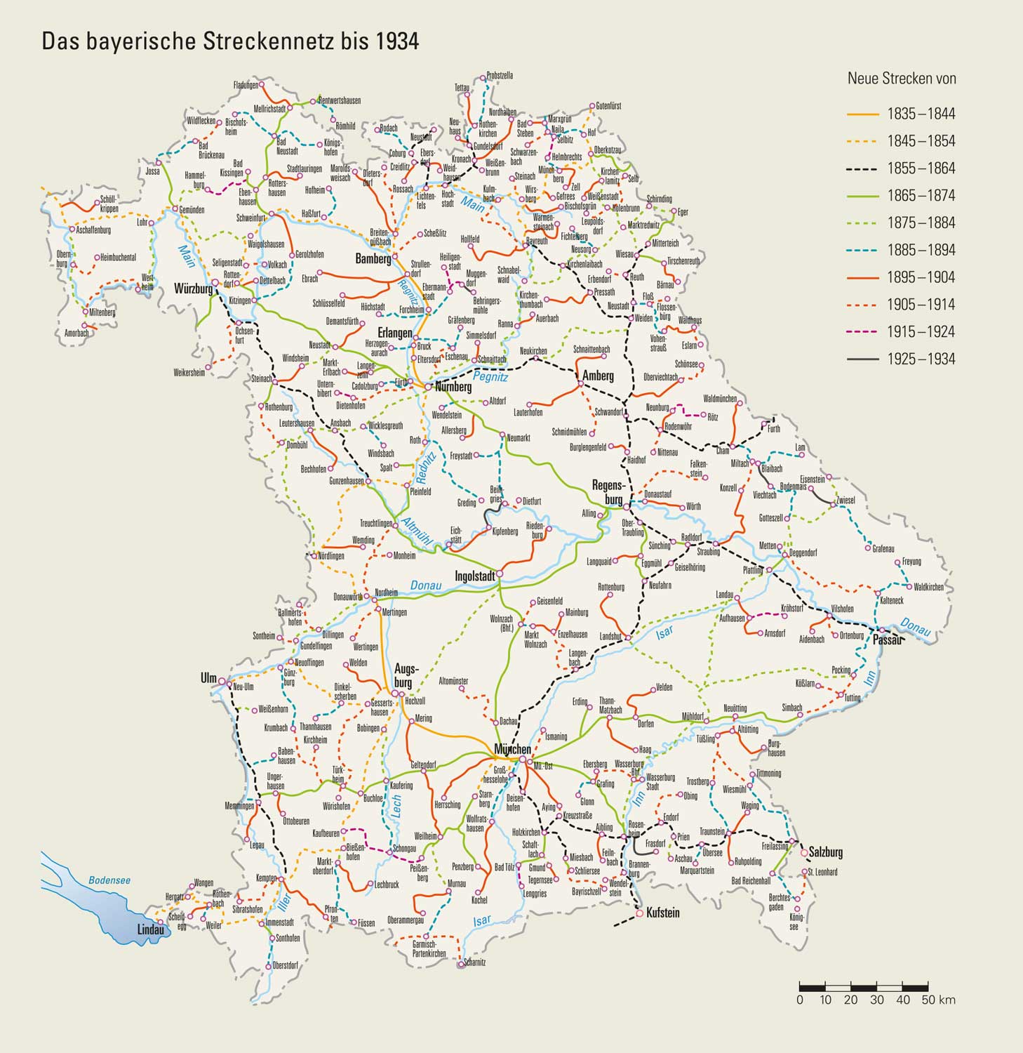 Das bayerische Eisenbahn-Streckennetz 1934. (Haus der Bayerischen Geschichte, Regensburg) HLB