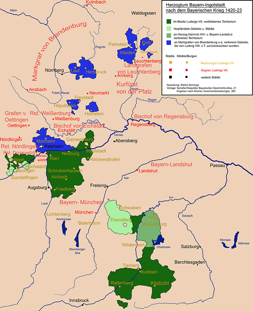 Das Herzogtum Bayern-Ingolstadt nach dem Ende des Bayerischen Krieges 1422 (Gestaltung: Stefan Schnupp; Vorlage: Spindler/Diepolder Bay. Geschichtsatlas, 21; Angaben nach: Kremer Auseinandersetzung, 362).