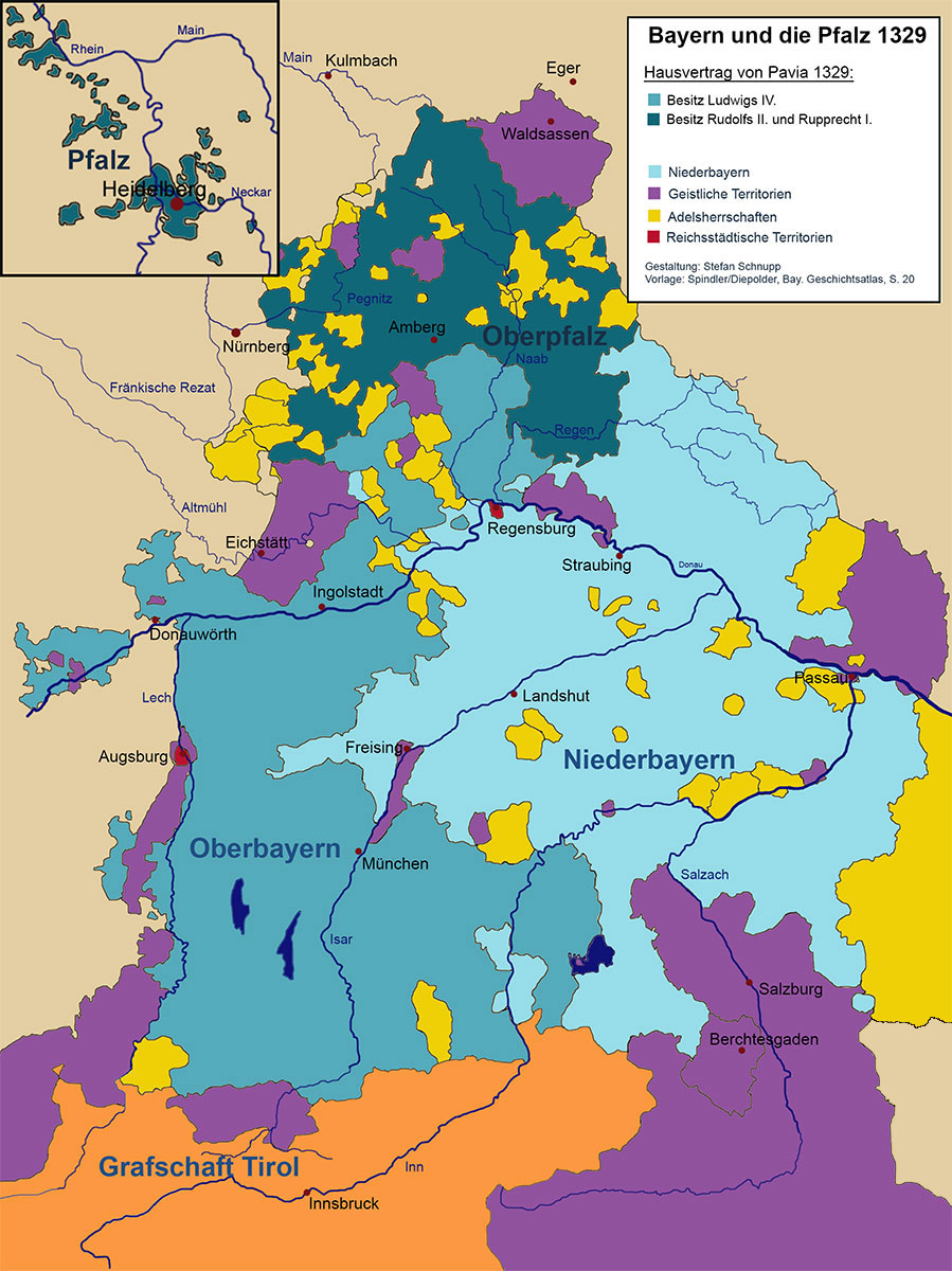 Bayern und die Pfalz nach dem Hausvertrag von Pavia (Gestaltung: Stefan Schnupp, Vorlage: Spindler/Diepolder, Bayerischer Geschichtsatlas, 20) HLB