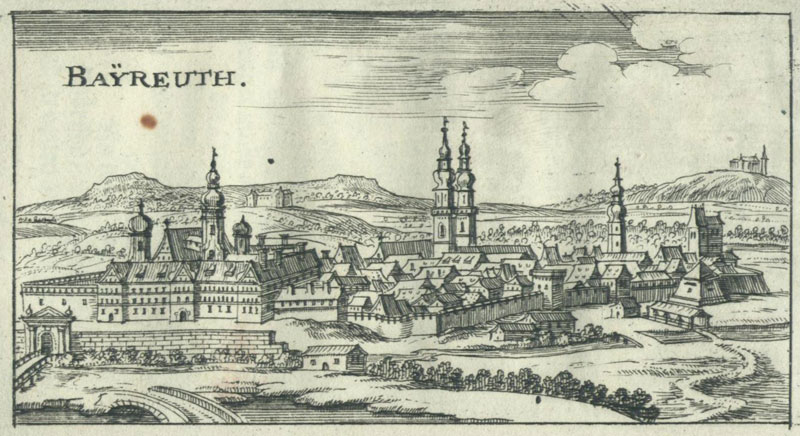 Stadtansicht von Bayreuth von 1689. Abb aus: Georg Christoph Eimmart, Vollständige Charta Von Frankenland, Nürnberg 1689. (Sächsische Universitäts- und Landesbibliothek, Geogr.Germ.260.b,misc.2 lizensiert durch CC-BY-SA 4.0)
