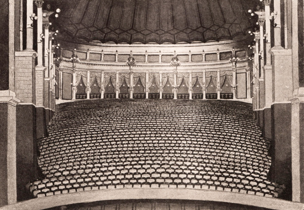 Der Zuschauerraum des Bayreuther Festspielhauses um 1904. (aus: Wolzogen, Hans von: Bayreuth, Berlin ca. 1904, nach S. 32; Bayerische Staatsbibliothek, Mus. Th. 5184 nt)
