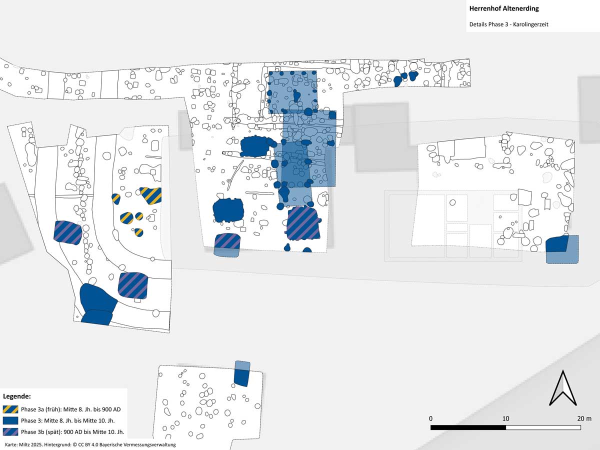 Befunde der archäologischen Phase 3 im Herrenhof Altenerding im Detail. Ca. Mitte 8. Jahrhundert bis Mitte 10. Jahrhundert. (Miltz. Kartenhintergrund: © Bayerische Vermessungsverwaltung lizenziert durch CC BY 4.0) HLB