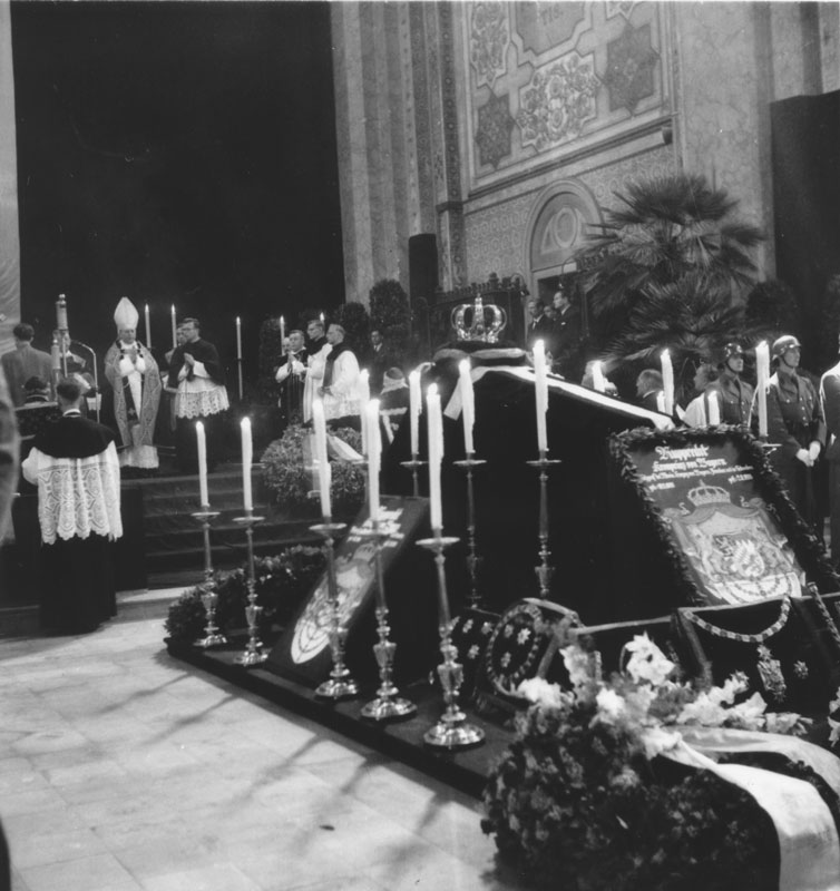 Aufbahrung Kronprinz Rupprecht von Bayern vor dem Altar der Ludwigskirche, 6. August 1955. (Fotografie von Felicitas Timpe (1923-2006), Bayerische Staatsbibliothek Bildarchiv timp-015553)