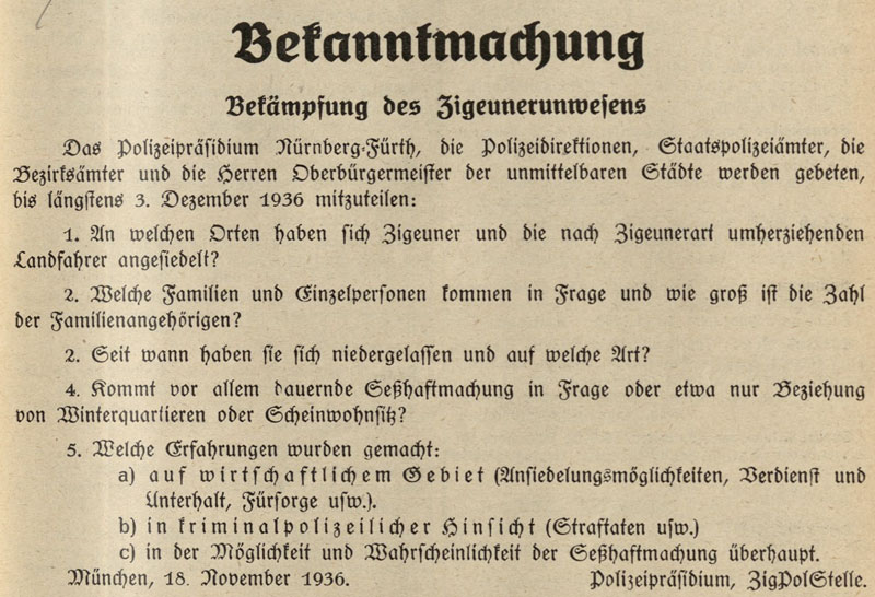 Bekanntmachung zur "Bekämpfung des Zigeunerunwesens". Aus: Bayerisches Polizeiblatt Nr. 174, 20. November 1936. (Bayerische Staatsbibliothek, 4 Bavar. 408-1936) HLB