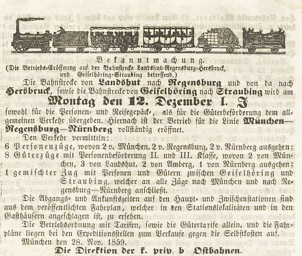 Bekanntmachung über die Inbetriebnahme wichtiger Ostbahnstrecken am 12. Dezember 1859. Abb. aus: Regensburger Tagblatt vom 03.12.1859. (Stadt Regensburg) HLB