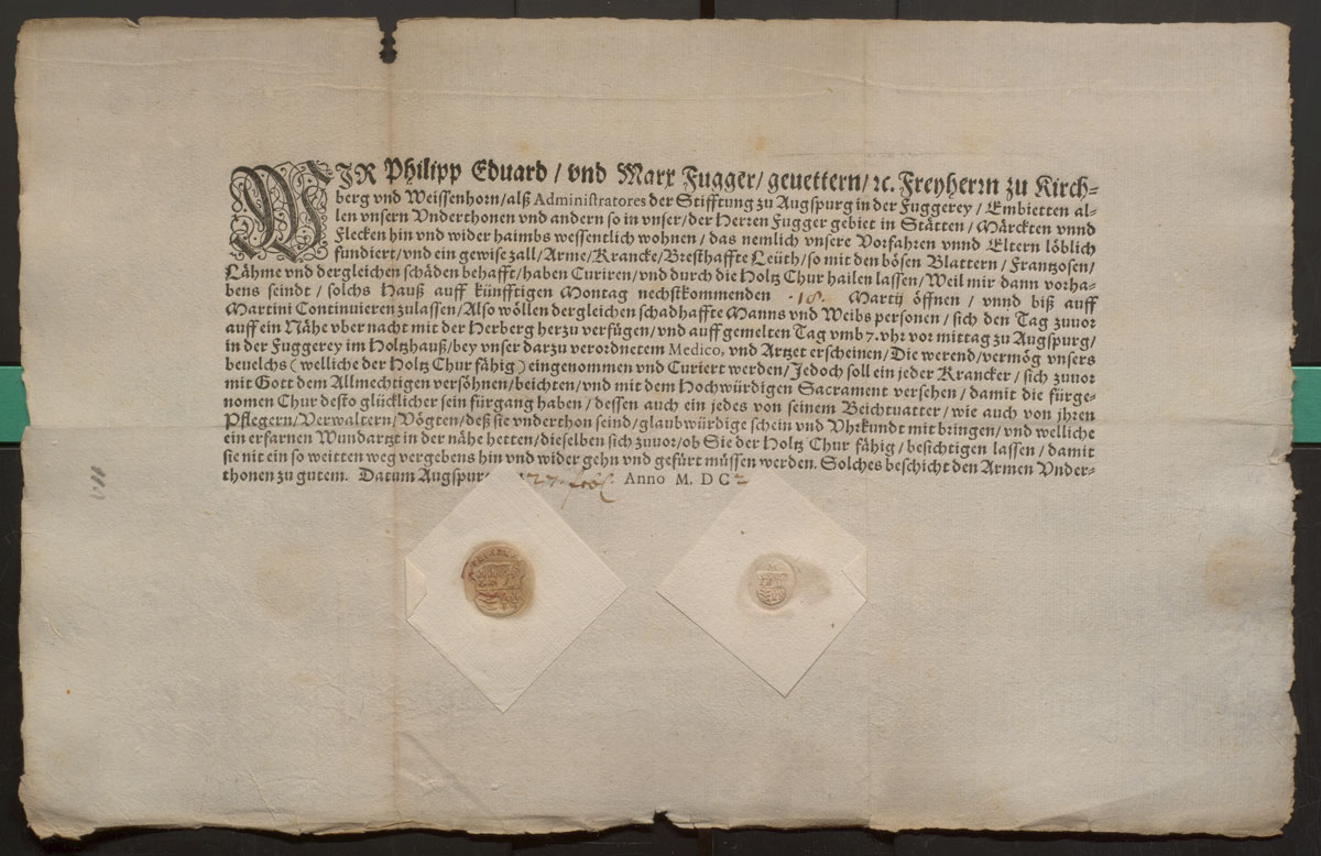 Bekanntmachung zum Beginn einer neuen "Holzkur", 1602. Behandlungen fanden üblicherweise vom Frühjahr bis in den Herbst statt. (Fürstlich und Gräflich Fuggersches Familien- und Stiftungsarchiv, FA 5.2.13) HLB