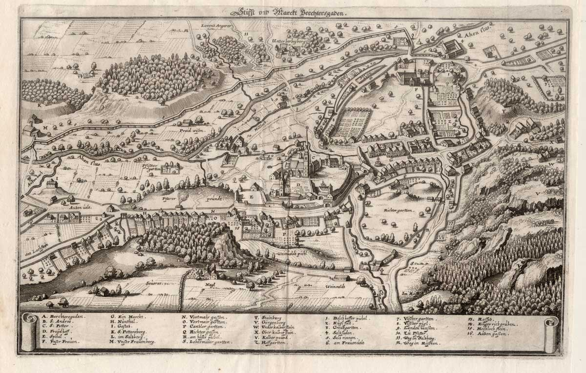 Markt und Stift Berchtesgaden, Kupferstich von Matthäus Merian,1644. (Stadtarchiv Bad Reichenhall) HLB