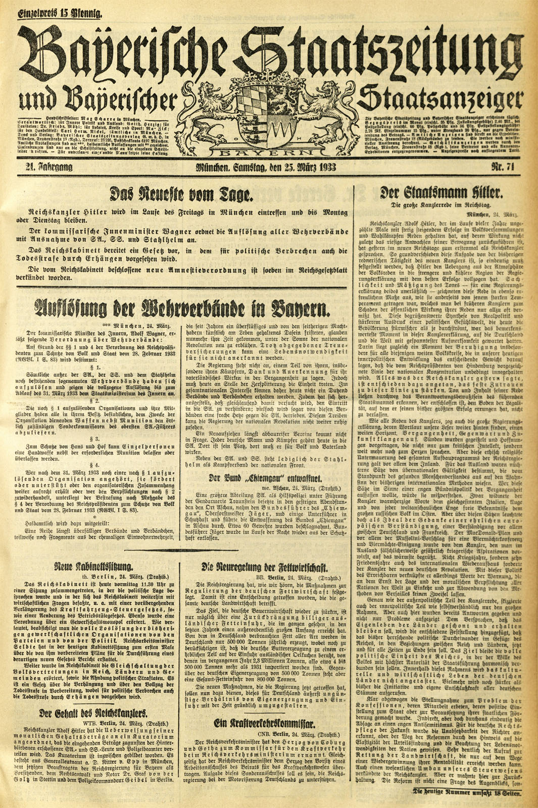 Bericht über die Auflösung der Wehrverbände am 24. März 1933. (aus: Bayerische Staatszeitung und Bayerischer Staatsanzeiger, 21. Jahrgang Nr. 71, München samstag 25. März 1933, 1. Bayerische Staatsbibliothek, 2. Eph. pol. 113 a-1933,1)