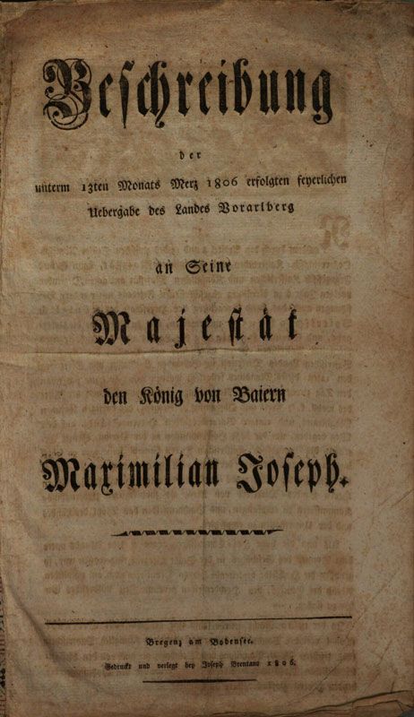 Titelseite der „Beschreibung der unterm 13ten Monats Merz 1806 erfolgten feyerlichen Uebergabe des Landes Vorarlberg an Seine Majestät den König von Baiern Maximilian Joseph“, Bregenz am Bodensee 1806 (Bayerische Staatsbibliothek -- 4 Bavar. 3427 s) HLB
