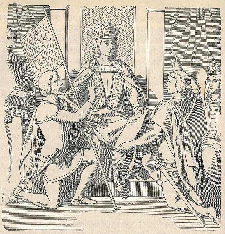 Die Herzöge Rudolf II. und Rupprecht I. beschwören vor Ludwig dem Bayern den Hausvertrag von Pavia. Stich von 1880. (Abb. aus: Joseph Maria Mayer, Das Regentenhaus Wittelsbach, oder: Geschichte Bayerns, Regensburg 1880, 290)