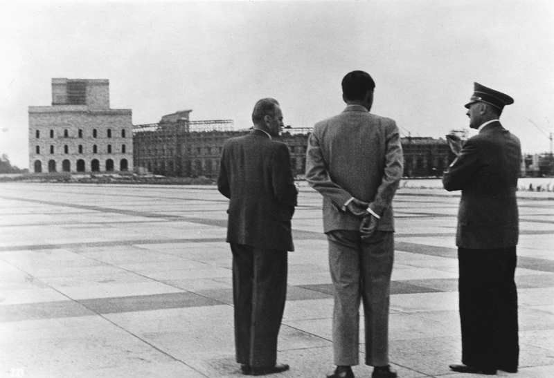 Gruppenfoto (v.r.) mit Adolf Hitler (1889-1945), Albert Speer (Minister, Architekt 1905-1981) und dem Nürnberger Hochbaureferenten Walter Brugmann auf der Großen Straße, 25. Juli 1939. Oben ist die Kongresshalle im Bau und oben links das 1:1-Modell der Kongresshallenfassade aus Holz zu erkennen. Fotografie von Heinrich Hoffmann. (Bayerische Staatsbibliothek, Bildarchiv hoff-26814) HLB