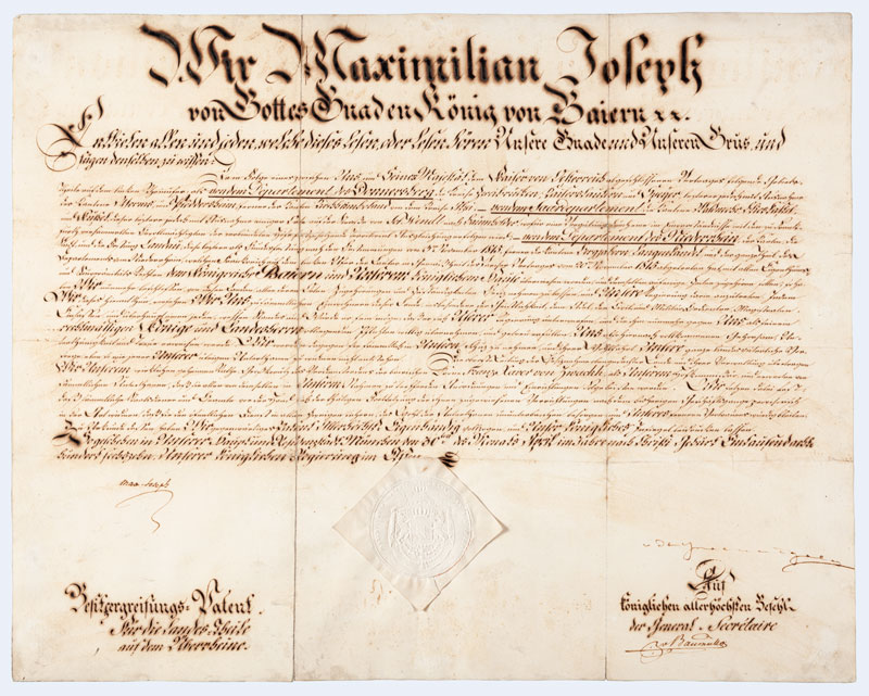 Besitzergreifungspatent König Max I. Josephs von Bayern für die Pfalz vom 30. April 1816. (Historisches Museum der Pfalz, Inventar-Nr. HM_0_02116)