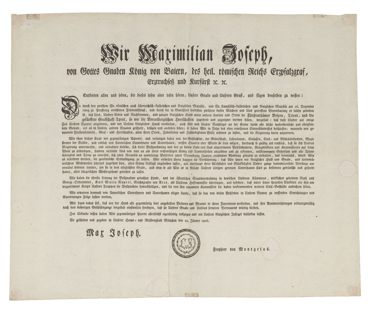 Besitzergreifungspatent des bayerischen Königs Max I. Joseph (1756-1825, reg. 1799-1825) für Tirol, München, 22. Januar 1806. (Tiroler Landesmuseen, Historische Sammlung, Flugschriften)