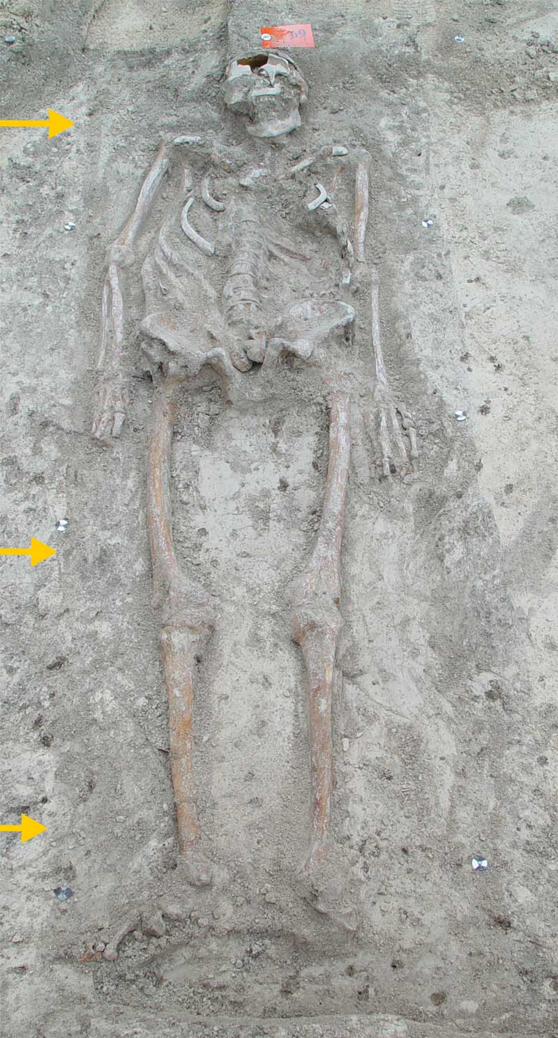 Bestattung aus dem Anfang oder der Mitte des 7. Jahrhunderts aus dem Friedhof auf dem Petersberg. Befund 69 mit Spuren eines Sargs. Datierungsspanne des Grabes: 95,4% Wahrscheinlichkeit zwischen 607 und 661 AD. (Editiert: Miltz, Originalfoto: Petra Haller, PLANAteam) HLB