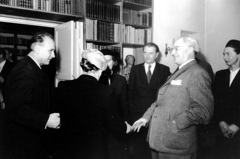 Besuch der Schriftstellerin Marie Rolland im Desch-Verlag im Januar 1952: (von li. nach re.) Kurt Desch (Verleger, 1903-1984), Marie Rolland (1895/96-1985), Eduard Brenner (Anglist, Staatssekretär 1888-1970), Marianne Langewiesche (Schriftstellerin 1908-1979). (Bayerische Staatsbibliothek, Bildarchiv timp-010153)