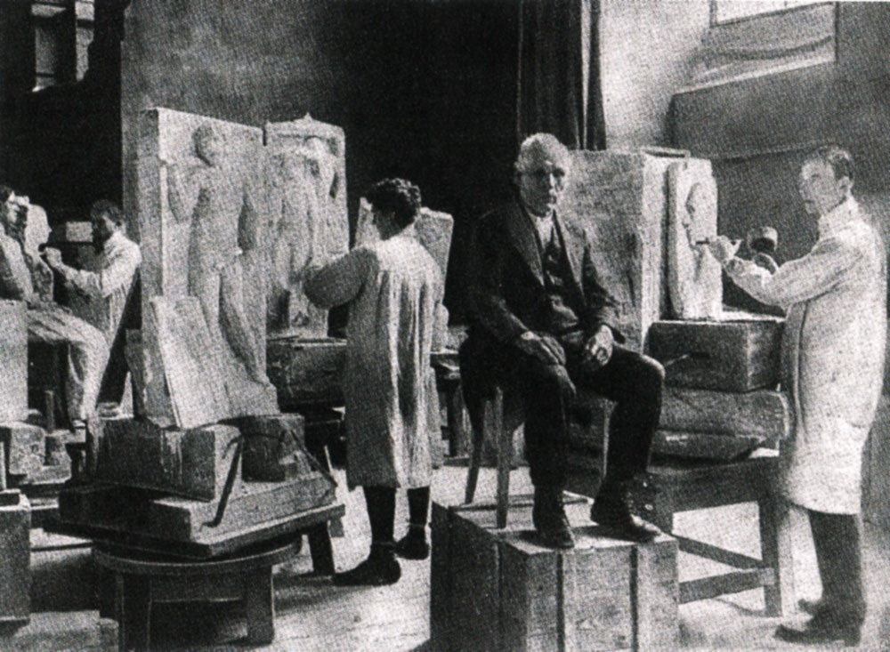 Die Bildhauerklasse Adolf von Hildebrands (1847-1921) an der Münchner Kunstakademie. (Aus: Die Woche 1909, Heft 48, 2059)
